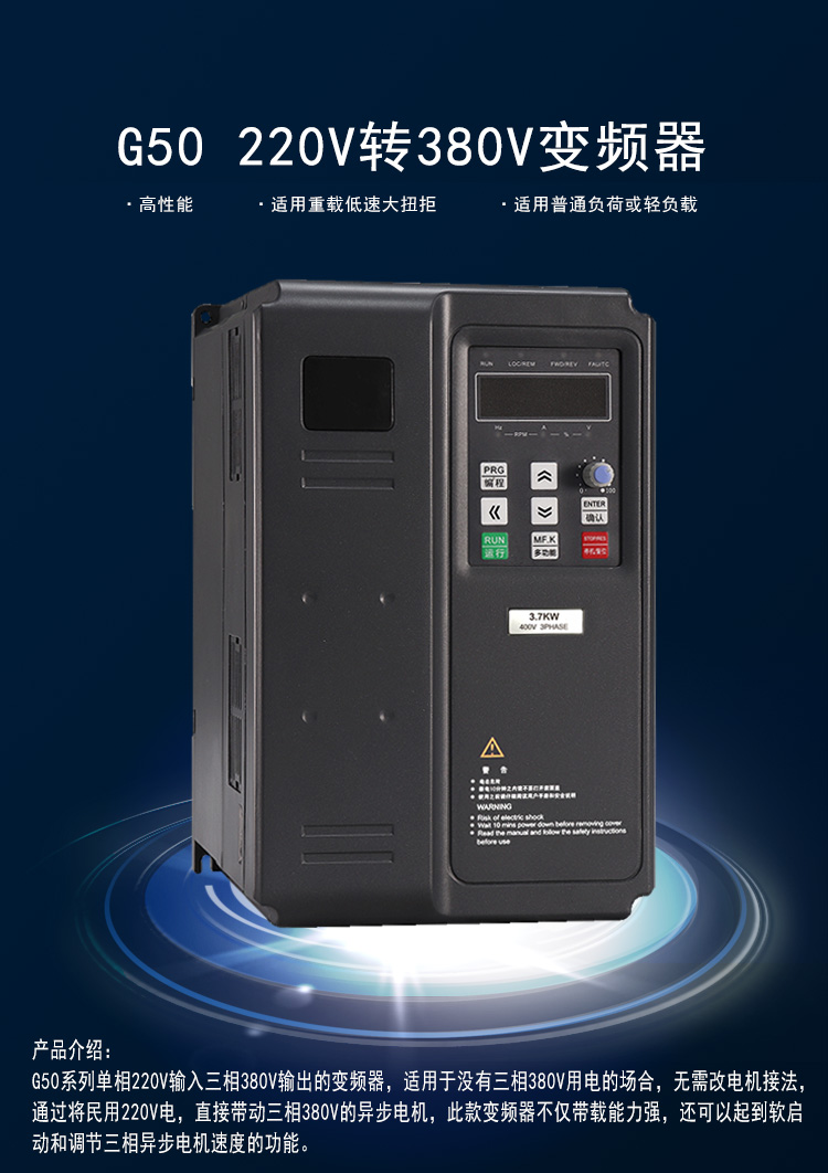 5800系列單相220V輸入三相380V輸出的變頻器,適用于沒有三相380V用電的場合,無需改電機接法,通過將民用220V電,直接帶動三相380V的異步電機,此款變頻器不僅帶載能力強,還可以起到軟啟動和調(diào)節(jié)三相異步電機速度的功能。